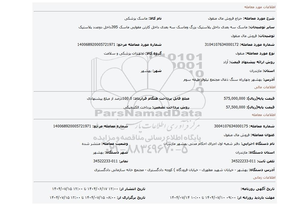 شرح مورد معامله: حراج فروش مال منقولنام کالا: ماسک پزشکی