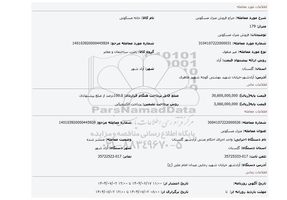 | نام دستگاه اجرایی: واحد اجرای احکام مدنی آزادشهر گلستان | وضعیت معامله: منتشر شده | |