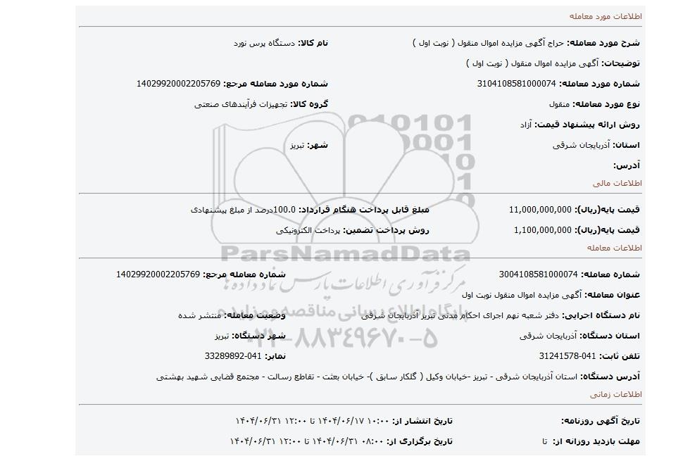نام دستگاه اجرایی: دفتر شعبه نهم اجرای احکام مدنی تبریز آذربایجان شرقیوضعیت معامله: منتشر شده