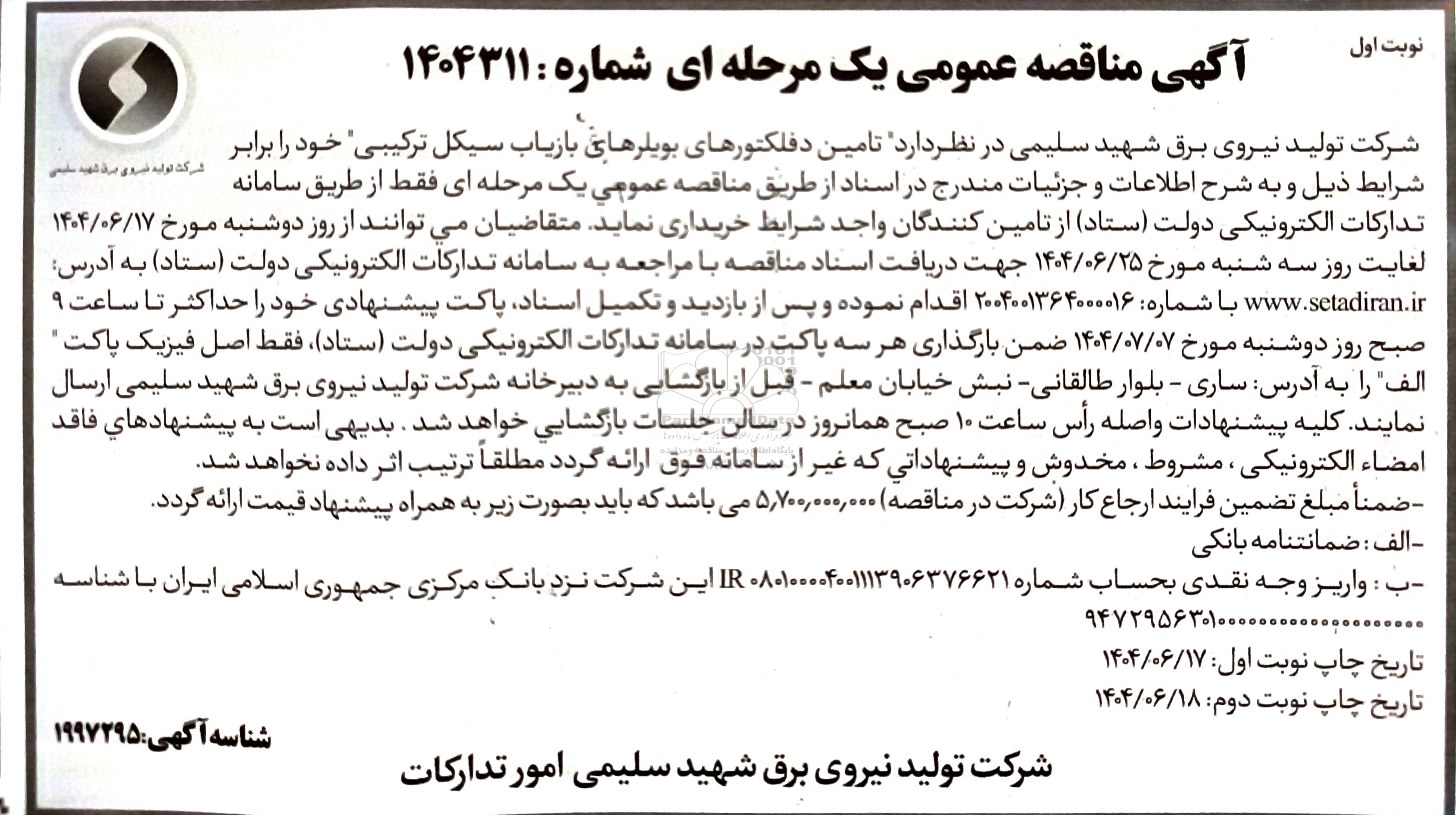 شرکت تولید نیروی برق شهید سلیمی در نظر دارد تامین دفلکتورهای بویلرهای بازیاب سیکل ترکیبی خود را برابر شرایط ذیل و به شرح اطلاعات و جزئیات مندرج در اسناد از طریق مناقصه عمومی یک مرحله ای فقط از طریق سامانه تدارکات الکترونیکی دولت (ستاد) از تامین کنندگان واجد شرایط خریداری نماید متقاضیان می توانند از روز دوشنبه مورخ 1404.06.17 لغایت روز سه شنبه مورخ 1404.06.25 جهت دریافت اسناد مناقصه با مراجعه به سامانه تدارکات الکترونیکی دولت (ستاد) به آدرس ستاد ایران با شماره 2004001364000016 اقدام نموده و پس از بازدید و تکمیل اسناد پاکت پیشنهادی خود را حداکثر تا ساعت 9 صبح روز دوشنبه مورخ 1404.07.07 ضمن بارگذاری هر سه پاکت در سامانه تدارکات الکترونیکی دولت (ستاد) فقط اصل فیزیک پاکت " الف را به آدرس ساری - بلوار طالقانی- نبش خیابان معلم - قبل از بازگشایی به دبیرخانه شرکت تولید نیروی برق شهید سلیمی ارسال نمایند. کلیه پیشنهادات واصله رأس ساعت 10 صبح همانروز در سالن جلسات بازگشایی خواهد شد. بدیهی است به پیشنهادهای فاقد امضاء الکترونیکی ، مشروط ، مخدوش و پیشنهاداتی که غیر از سامانه فوق ارائه گردد مطلقاً ترتیب اثر داده نخواهد شد.