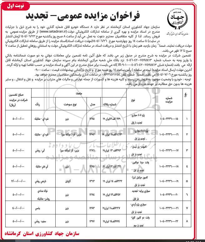 سازمان جهاد کشاورزی استان کرمانشاه در نظر دارد 8 دستگاه خودرو قابل شماره گذاری خود را به شرح ذیل با جزئیات کرمانشاه مندرج در اسناد مزایده و بهره گیری از سامانه تدارکات الکترونيکی دولت ستاد ایران از طریق مزایده عمومی به فروش رساند. لذا از کلیه متقاضیان محترم دعوت به عمل می آید از ساعت 8 صبح روز یکشنبه مورخ 1404.6.23 زمان انتشار در سایت تا ساعت 14 روز چهارشنبه مورخ 1404.6.26 مهلت دریافت اسناد اسناد مزایده را از طریق سامانه تدارکات الکترونيکی دولت دریافت نمایند. ضمنا زمان بازدید هم زمان با تاریخ انتشار و دریافت اسناد در سامانه تدارکات الکترونیکی دولت به استثنای روزهای تعطیل از ساعت 7 صبح تا 12 ظهر می باشد.