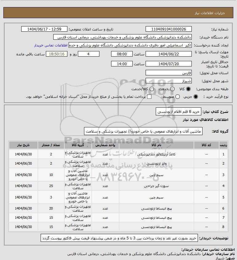 شرح کلی نیاز: خرید 8 قلم اقلام ارتودنسی