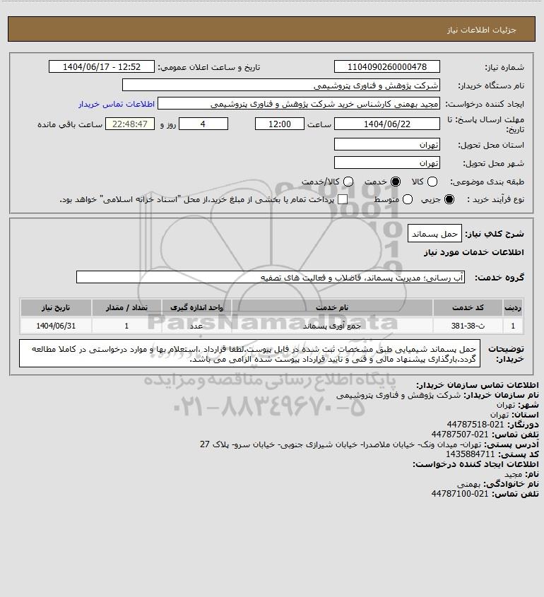 توضیحات خریدار:حمل پسماند شیمیایی طبق مشخصات ثبت شده در فایل پیوست.لطفا قرارداد ،استعلام بها و موارد درخواستی در کاملا مطالعه گردد.بارگذاری پیشنهاد مالی و فنی و تایید قرارداد پیوست شده الزامی می باشد.