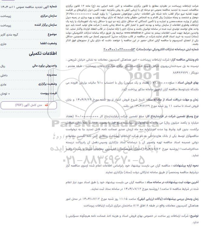 نوع و مبلغ تضمین شرکت در فرایند ارجاع کار مبلغ تضمین شرکت در فرایند ارجاع کار 70.100.000.000 (هفتاد میلیارد و یکصد میلیون ریال) می باشد که مناقصهگران میبایست مبلغ فوق را بصورت ضمانت نامه بانکی غیر قابل برگشت بدون قید و شرط و با مدت اعتبار اولیه سه ماه از زمان صدور ضمانت نامه قابل تمدید بنا به درخواست مناقصهگزار توسط یکی از بانک های داخلی به نام شرکت ارتباطات زیر ساخت و مطابق آئین نامه تضمین معاملات دولتی ضمیمه اسناد مناقصه تهیه و تصویر آن را در سامانه ستاد بازگذاری و سپس اصل آن را در پاکت در بسته حداکثر تا ساعت 1 1 روزشنبه مورخ 1404.07.12 تحویل امور هماهنگی کمیسیون معاملات نموده و رسید دریافت نماید.
