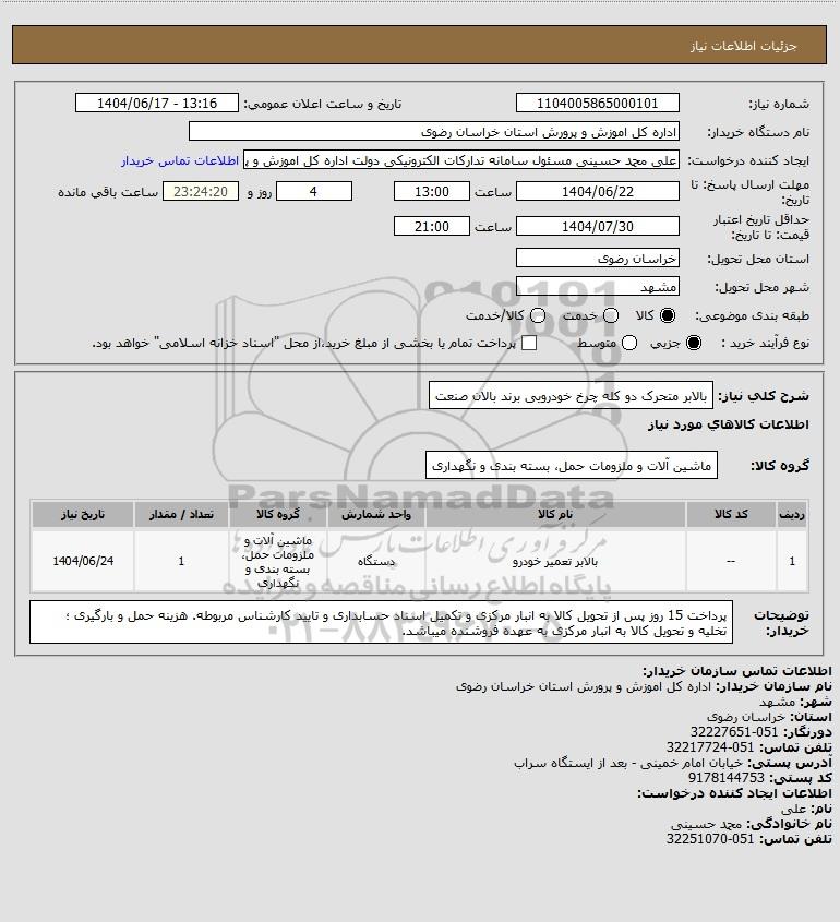 شرح کلی نیاز: بالابر متحرک دو کله چرخ خودرویی برند بالان صنعت