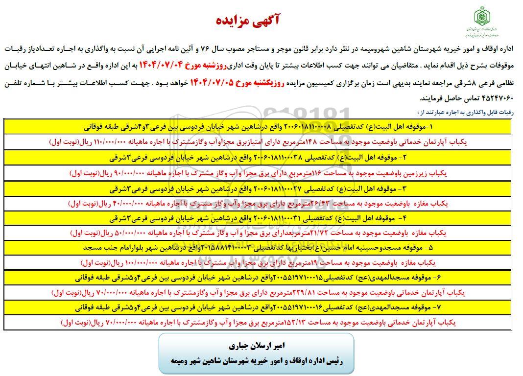 اداره اوقاف و امور خیریه شهرستان شاهین شهر و میمه در نظر دارد برابر قانون موجر و مستاجر مصوب سال 76 و آئین نامه اجرایی آن نسبت به واگذاری به اجاره تعدادی از رقبات موقوفات بشرح ذیل اقدام نماید. متقاضیان میتوانند جهت کسب اطلاعات بیشتر تا پایان وقت اداری روز شنبه مورخ 1404.07.04 به این اداره واقع در شاهین انتهای خیابان نظامی فرعی 8 شرقی مراجعه نمایند بدیهی است زمان برگزاری کمیسیون مزایده روزیکشنبه مورخ 1404.07.05 خواهد بود. جهت کسب اطلاعات بیشتر با شماره تلفن 45247060 تماس حاصل فرمایند.