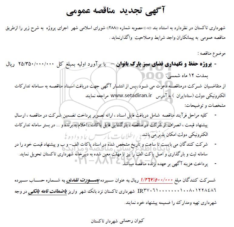 موضوع مناقصه : پروژه حفظ و نگهداری فضای سبز پارک بانوان - با براورد اولیه به مبلغ کل 25.350.000.000 ریال به مدت 12 ماه شمسی