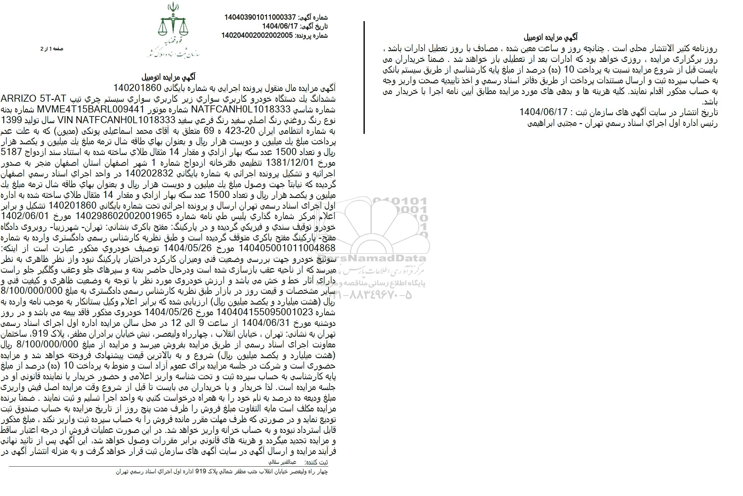 مزایده ششدانگ یک دستگاه خودرو کاربری سواری چری