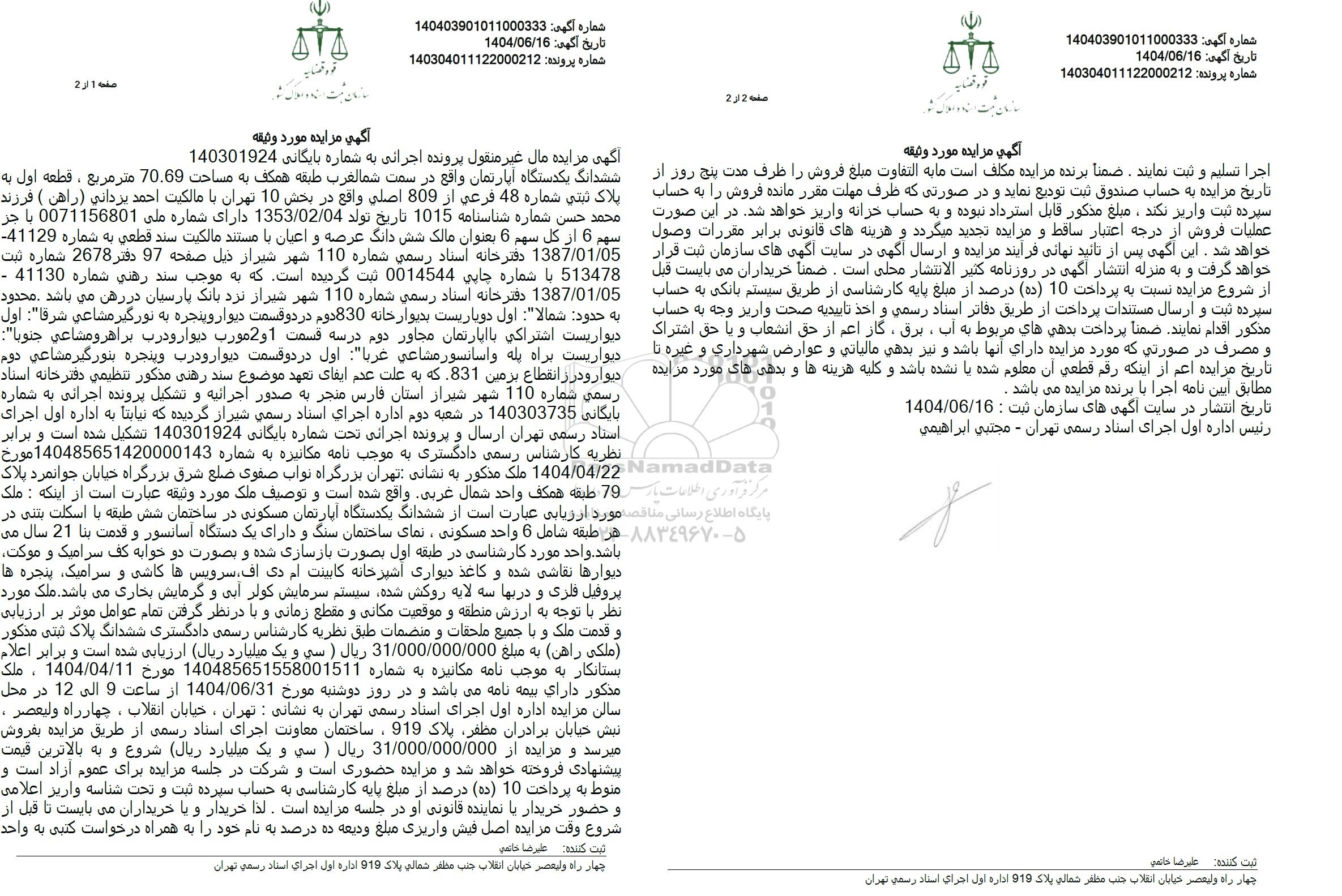موضوع مزایده : یک دستگاه آپارتمان مسکونی تحت پلاک ثبتی 48 فرعی از 809 اصلی به مساحت 70.69 مترمربع به ارزش 31.000.000.000 ریال