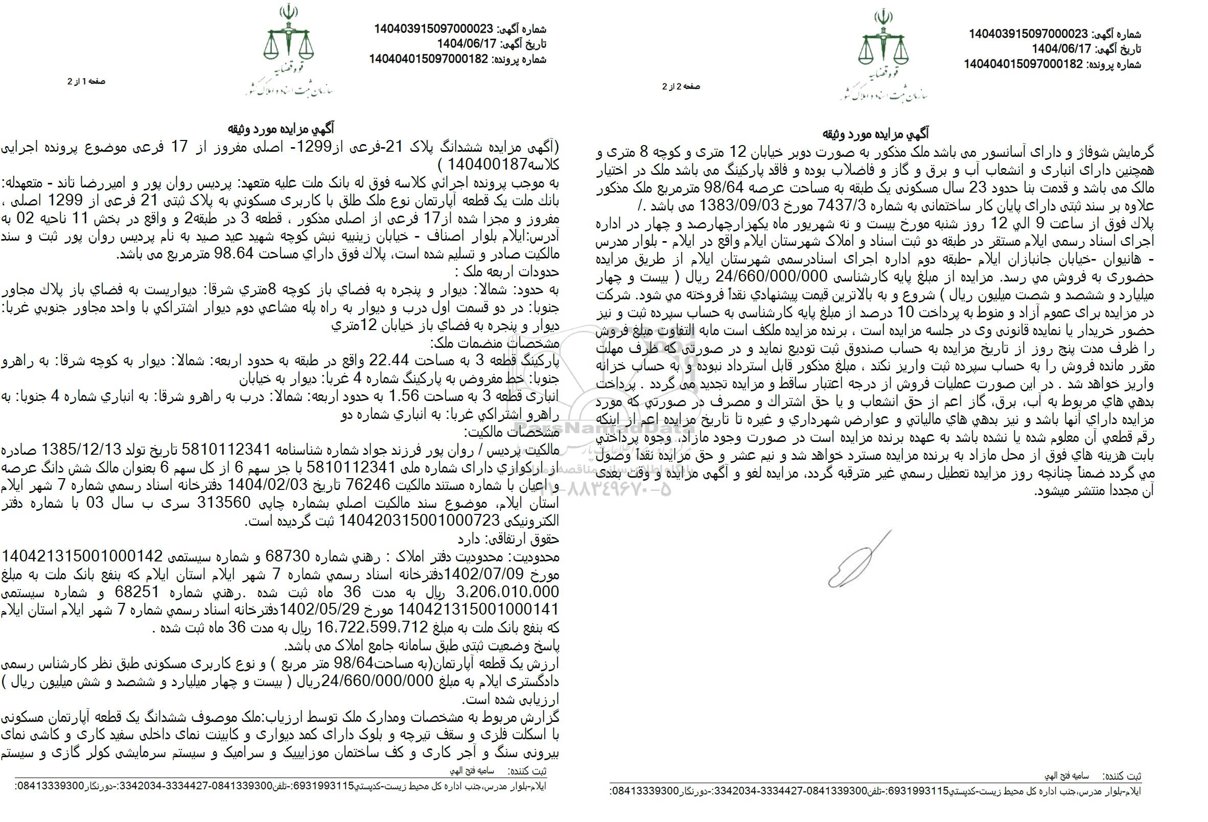 مزایده فروش ملک به پلاک ثبتی 21 فرعی از 1299 اصلی به مساحت 98.64 مترمربع