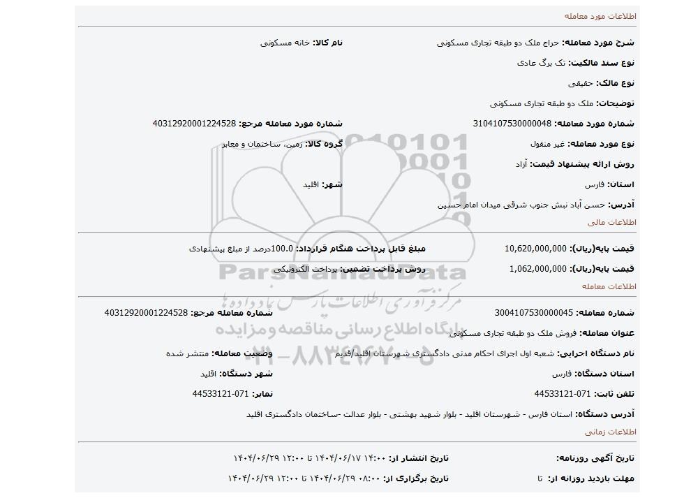 | شماره مورد معامله: 3104107530000048 | شماره مورد معامله مرجع: 40312920001224528 | |