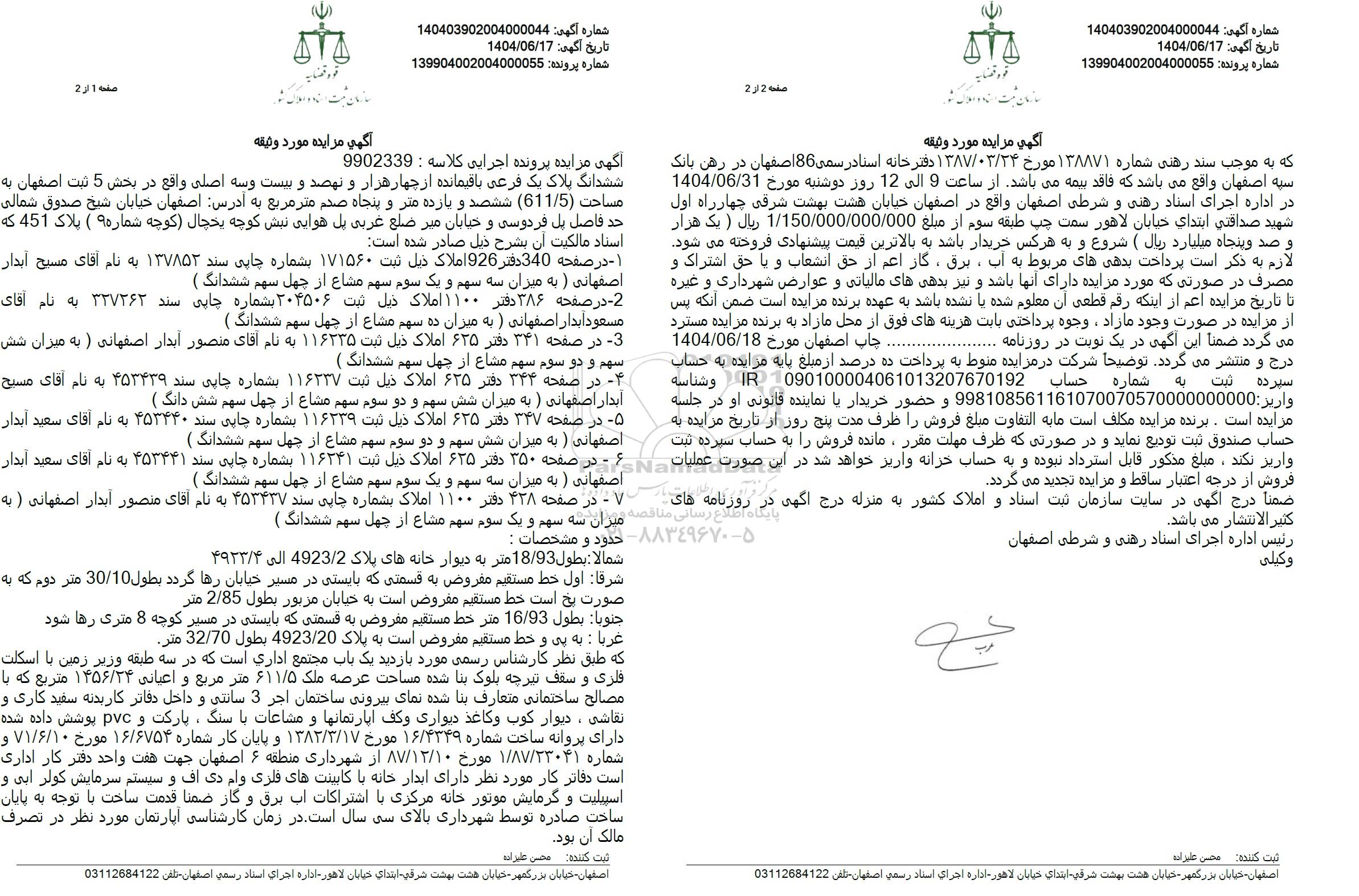 مزایده فروش ملک به مساحت 611.5 مترمربع