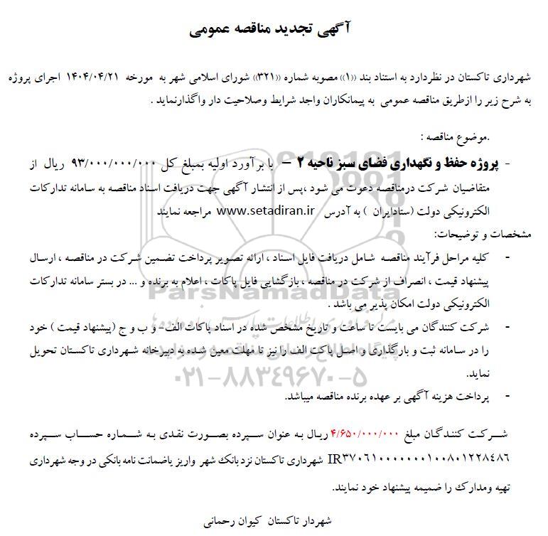 - پروژه حفظ و نگهداری فضای سبز ناحیه 2 - با برآورد اولیه به مبلغ کل 93.000.000.000 ریال از متقاضیان شرکت در مناقصه دعوت می شود پس از انتشار آگهی جهت دریافت اسناد مناقصه به سامانه تدارکات الکترونیکی دولت ستاد ایران به آدرس ستاد ایران مراجعه نمایند.