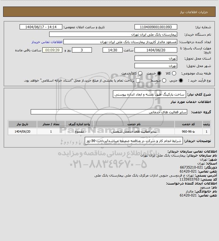 استعلام بها و موضوع استعلام استعلام ساخت پارکینگ طبق نقشه و ابعاد اندازه پیوستی به اطلاع کلیه شرکت‌ها و افراد متخصص واجد شرایط می‌رساند، آگهی گذار در نظر دارد از طریق استعلام بها، نسبت به انتخاب و دریافت پیشنهادات اقدام نماید. این استعلام با کد آگهی ثبت شده در سامانه خبرگزاری پارس نماد : 9520811 منتشر شده است. مشخصات استعلام : تاریخ شروع استعلام: 1404/06/17 آخرین مهلت ارسال پیشنهاد قیمت : 1404/06/20 و محل اجرای پروژه : استان تهران میباشد. استعلام قیمت مورد درخواست : استعلام ساخت پارکینگ طبق نقشه و ابعاد اندازه پیوستی با دسته‌بندی‌های تخصصی و گروه های مرتبط : ساختمان, استعلام اطلاع رسانی میگردد.