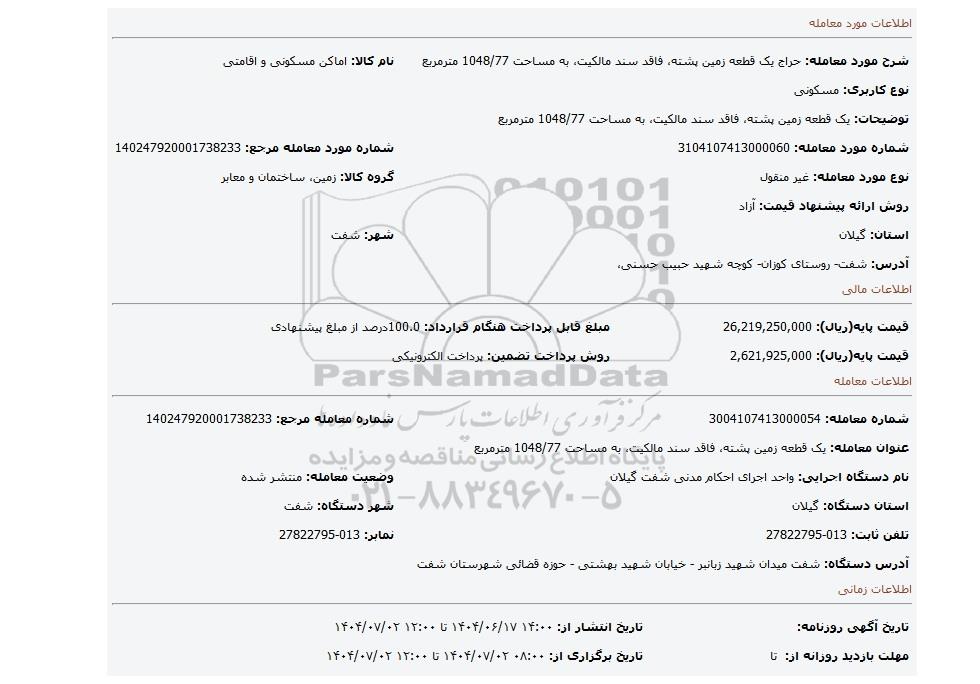 | شرح مورد معامله: حراج یک قطعه زمین پشته، فاقد سند مالکیت، به مساحت 1048/77 مترمربع | نام کالا: اماکن مسکونی و اقامتی | |