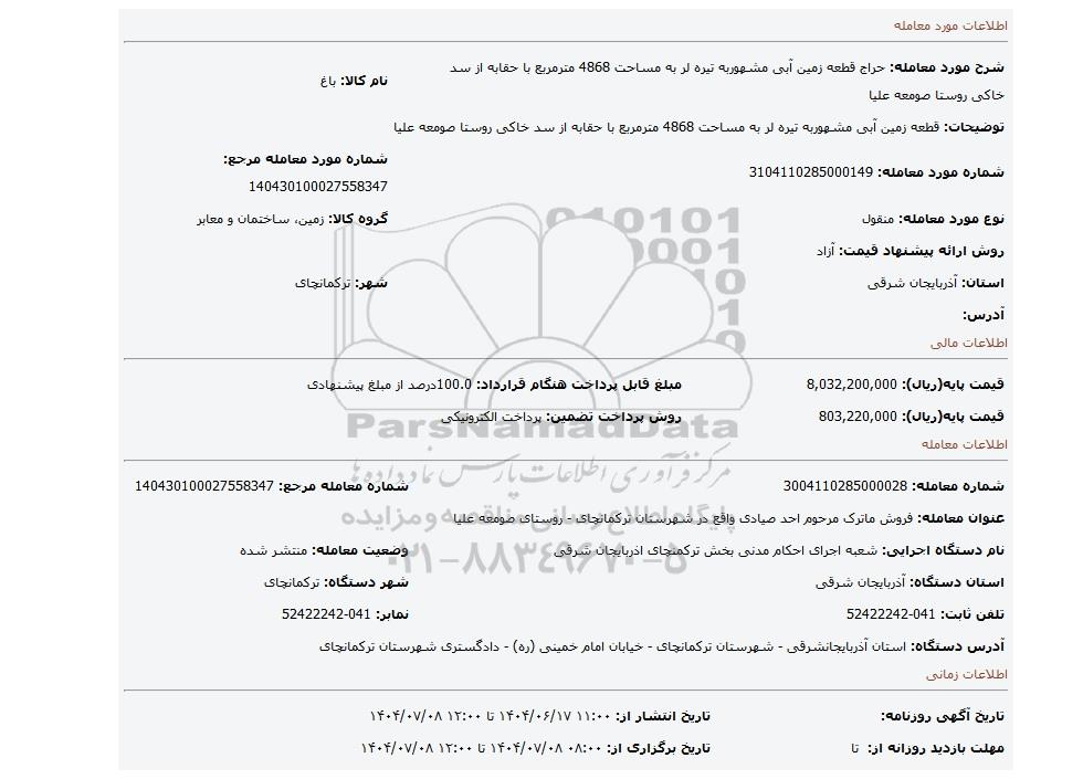 | عنوان معامله: فروش ماترک مرحوم احد صیادی واقع در شهرستان ترکمانچای - روستای صومعه علیا | ||