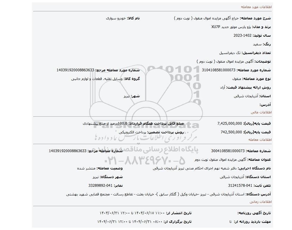 | شماره مورد معامله: 3104108581000073 | شماره مورد معامله مرجع: 140391920008863633 | |