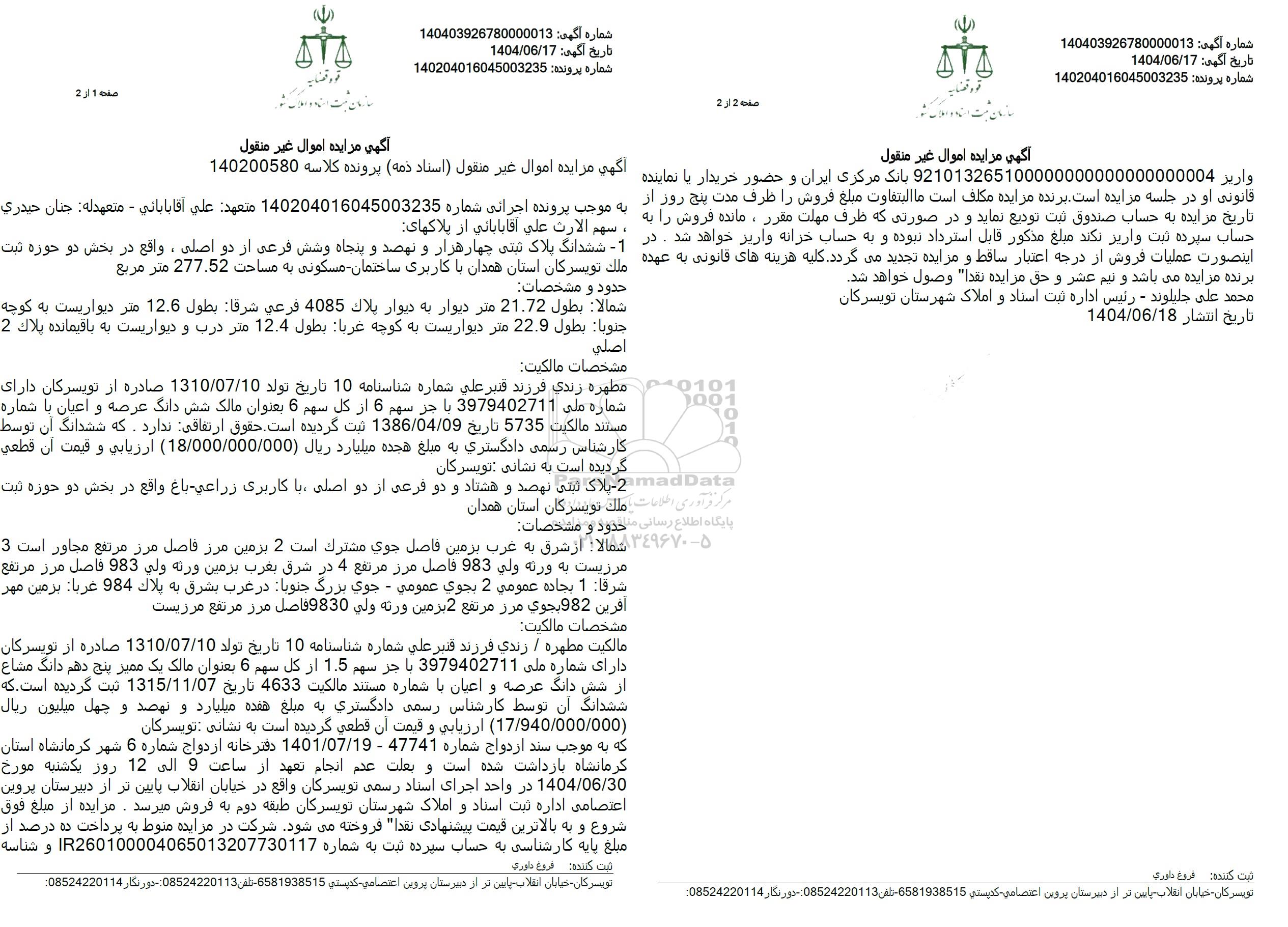 مزایده فروش ملک به پلاک ثبتی 4956 فرعی از 2 اصلی به مساحت 277.52 مترمربع