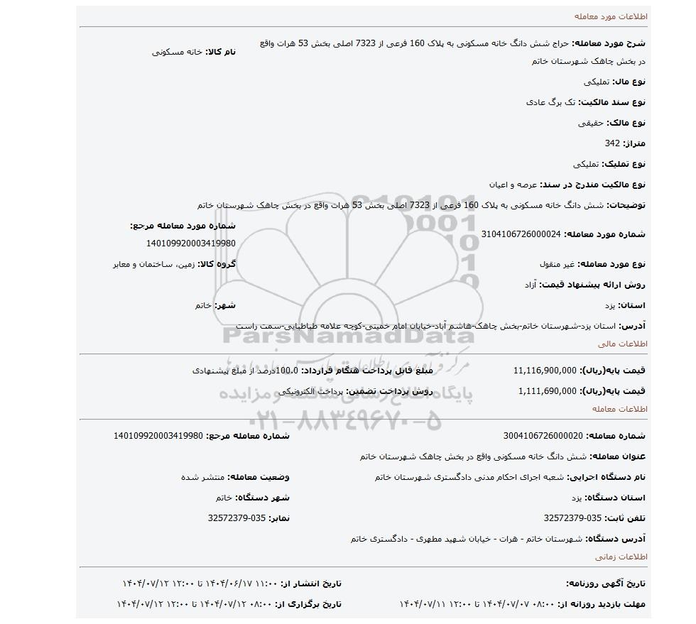 | شماره مورد معامله: 3104106726000024 | شماره مورد معامله مرجع: 140109920003419980 | |