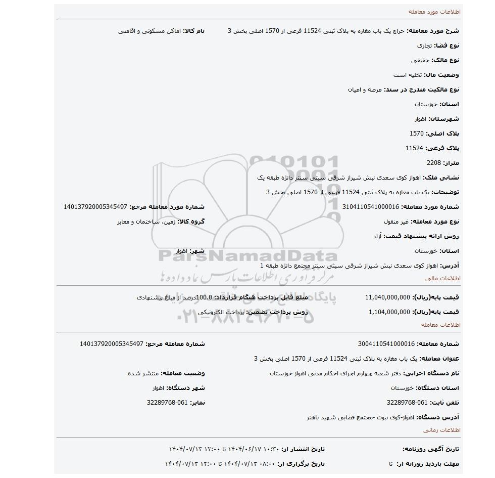 | شرح مورد معامله: حراج یک باب مغازه به پلاک ثبتی 11524 فرعی از 1570 اصلی بخش 3 | نام کالا: اماکن مسکونی و اقامتی | |