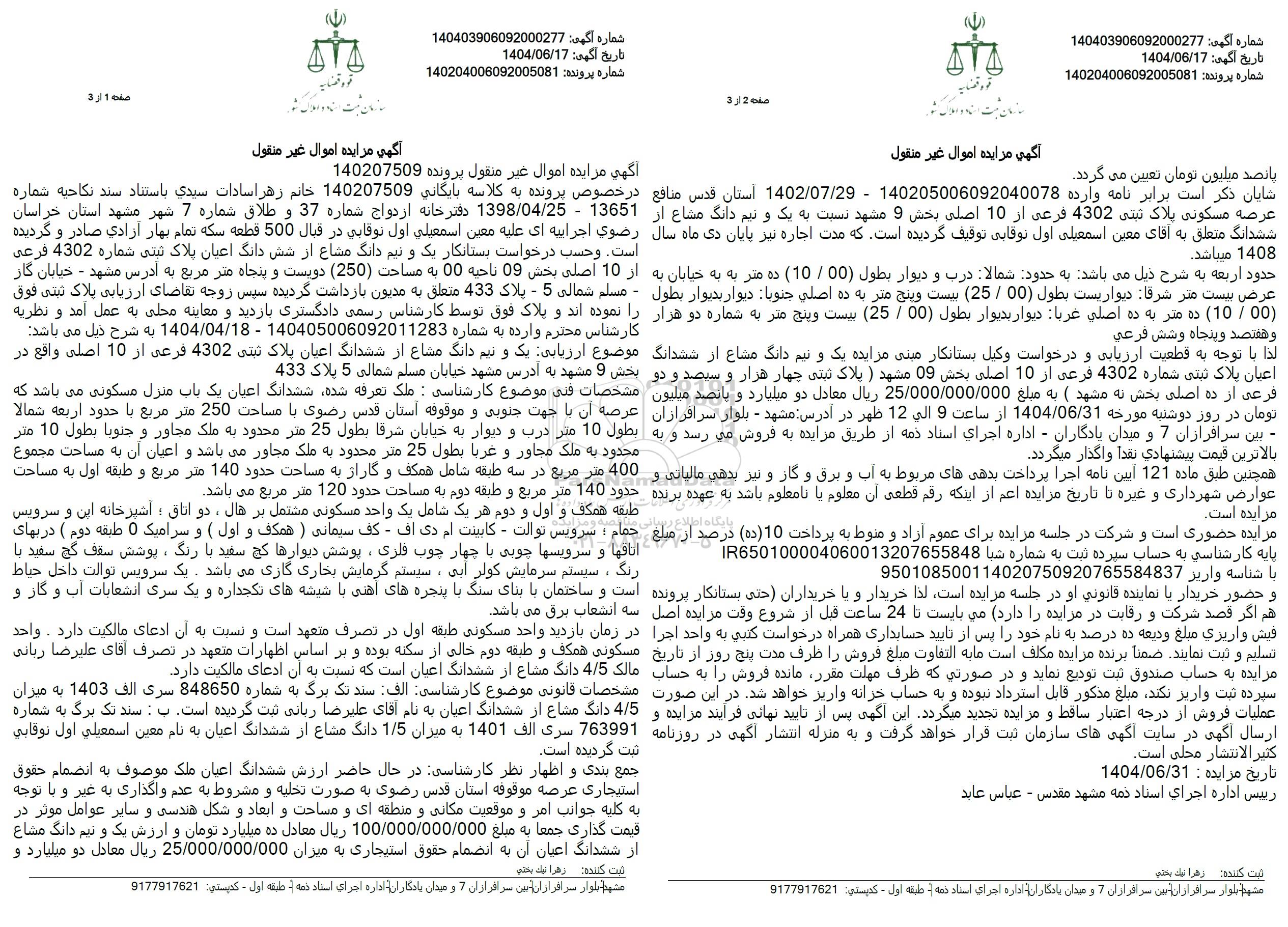 مزایده یک و نیم دانگ از ششدانگ پلاک ثبتی 4302 فرعی از 10 اصلی
