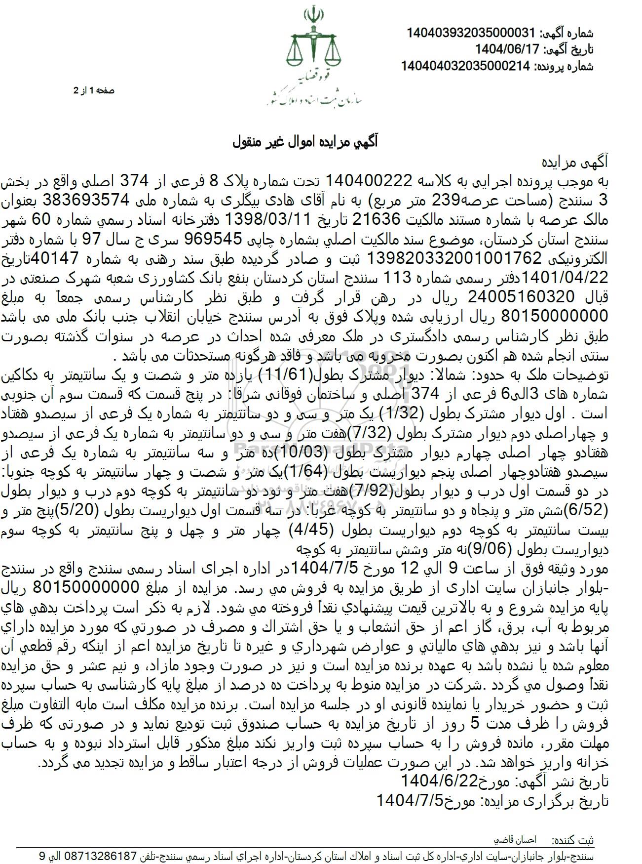 مزایده فروش شماره پلاک 8 فرعی از 374 اصلی