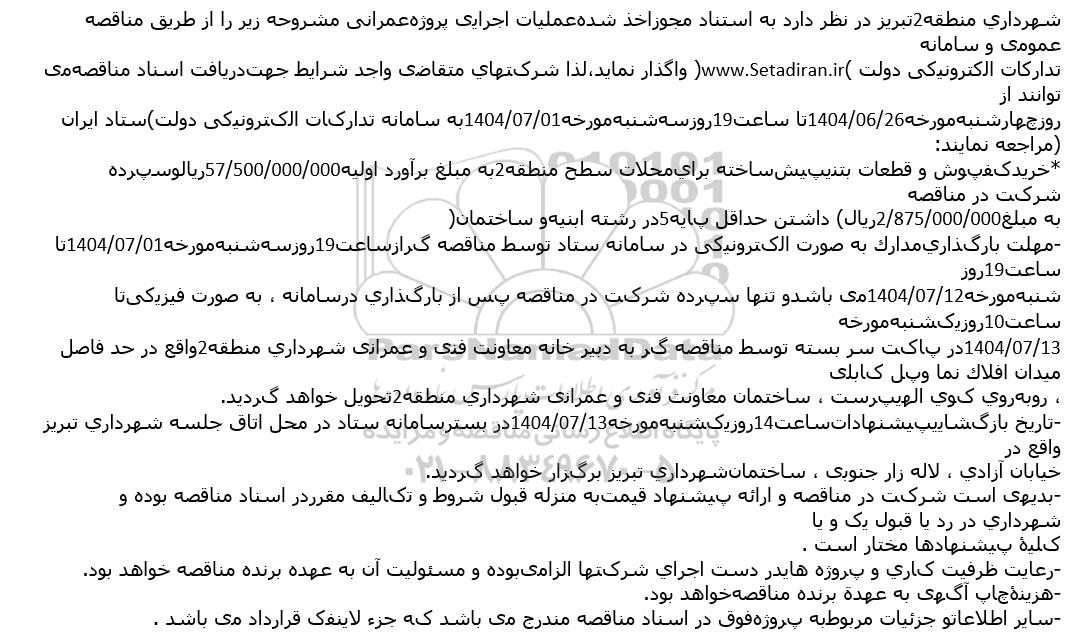 شهرداری منطقه 2 تبریز در نظر دارد به استناد مجوز اخذ شده عملیات اجرایی پروژه عمرانی مشروحه زیر را از طریق مناقصه عمومی و سامانه تدارکات الکترونیکی دولت (ستاد ایران) واگذار نماید لذا شرکتهای متقاضی واجد شرایط جهت دریافت اسناد مناقصه میتوانند از روز چهارشنبه مورخه 1404.06.26 تا ساعت 19 روز سه شنبه مورخه 1404.07.01 به سامانه تدارکات الکترونیکی دولت ستاد ایران مراجعه نمایند.