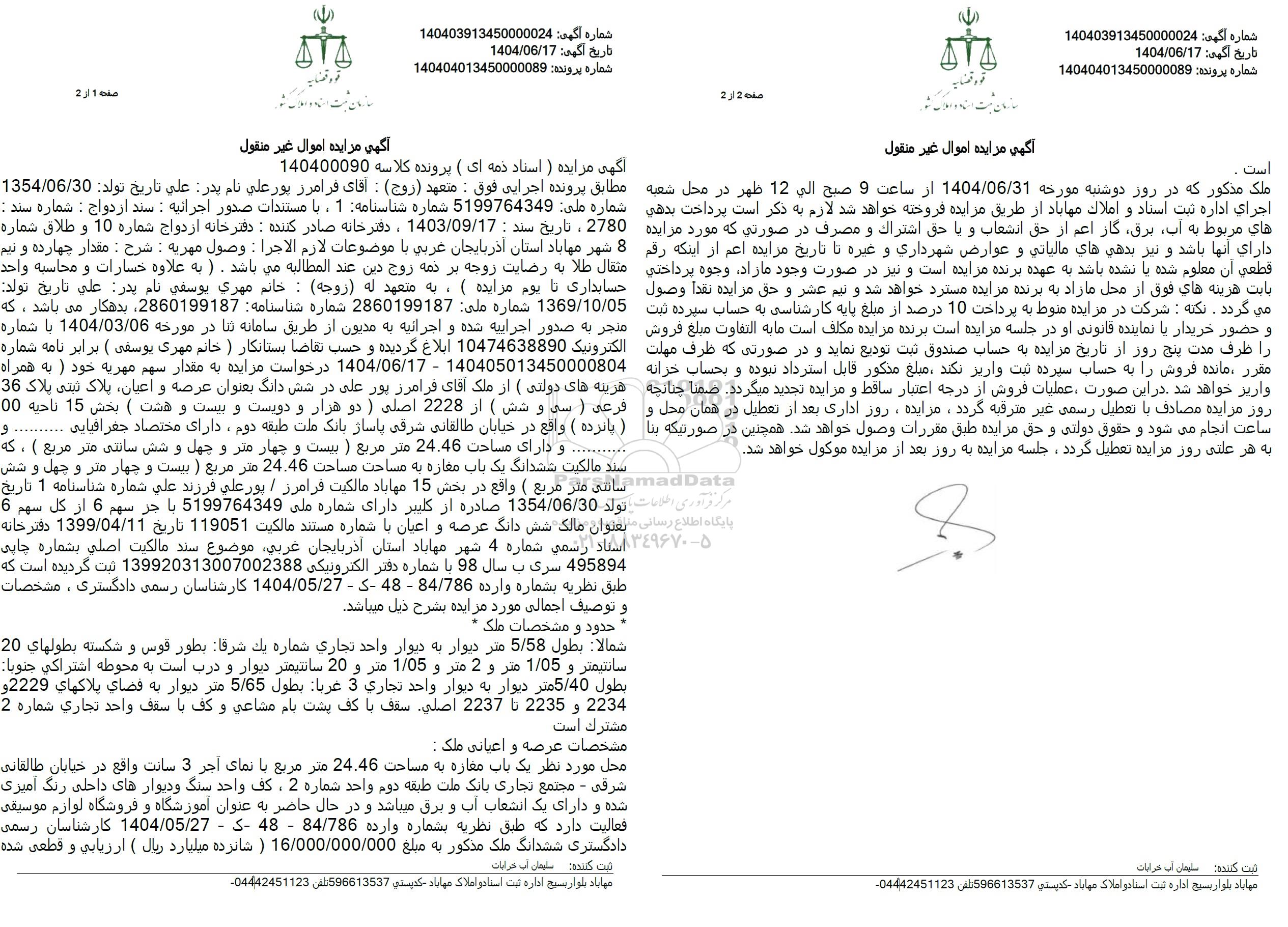 مزایده فروش یک باب مغازه به مساحت 24.46 مترمربع به پلاک ثبتی 36 فرعی از 2228 اصلی