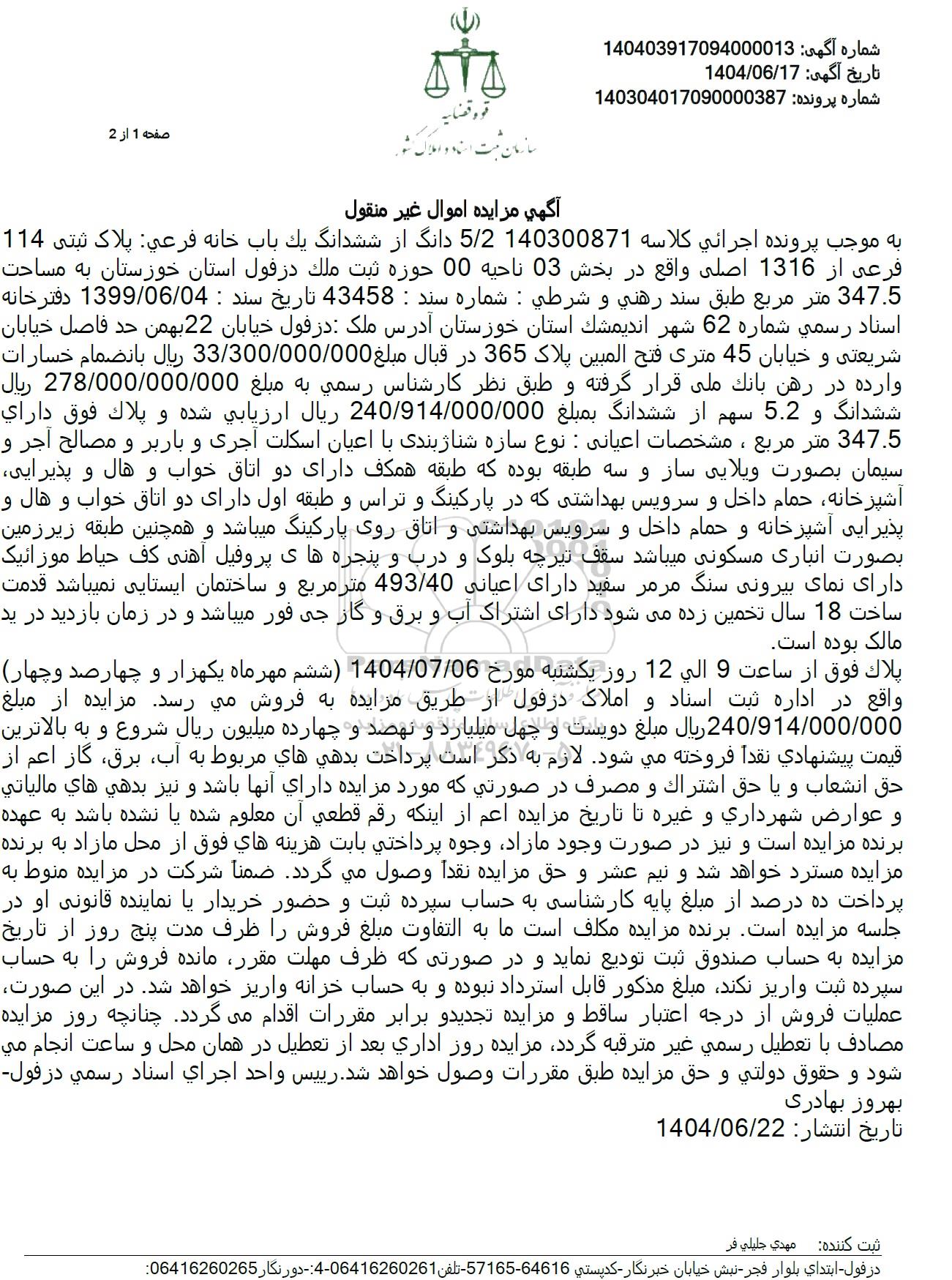 مزایده فروش یک باب خانه به پلاک ثبتی 114 فرعی از 1316 اصلی به مساحت 347.5 مترمربع