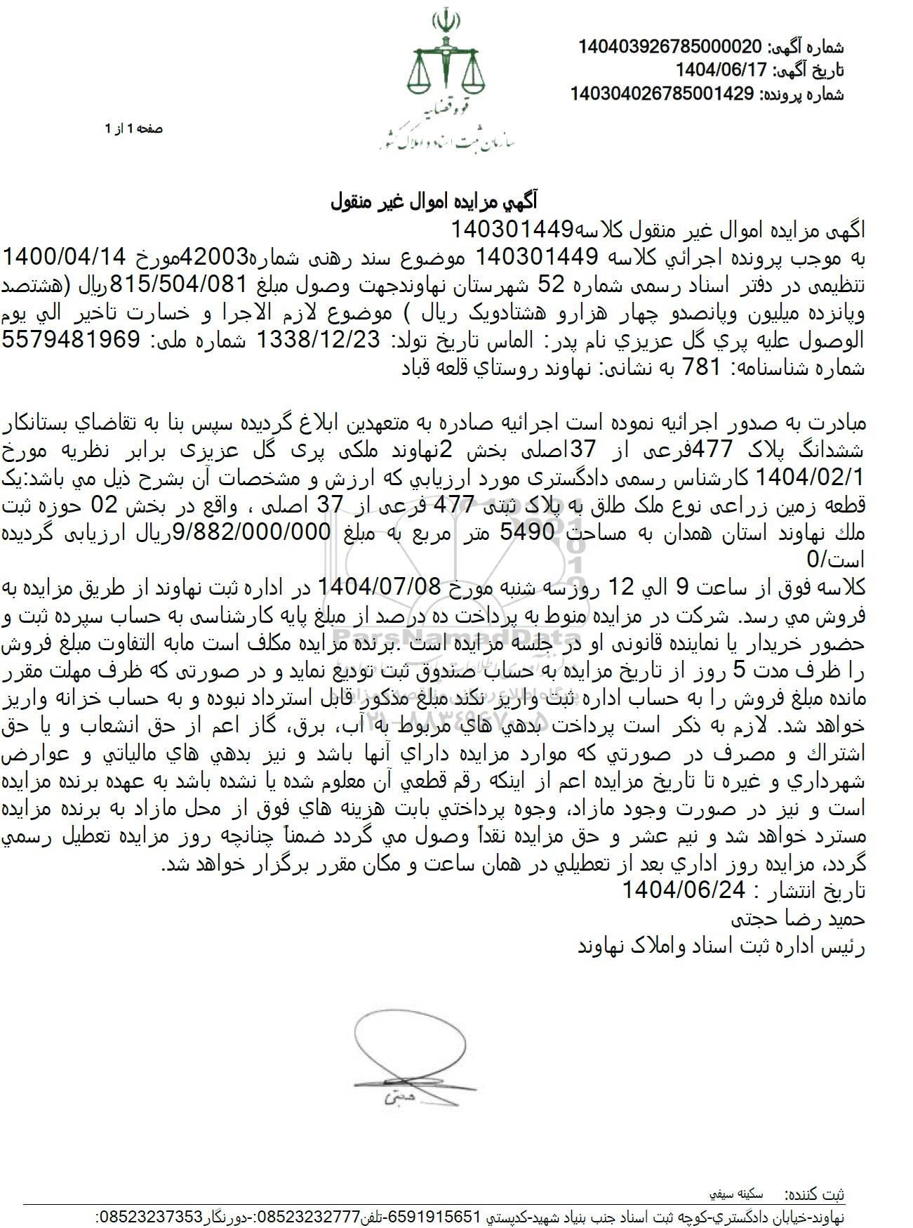 شماره آگهی : 140403926785000020