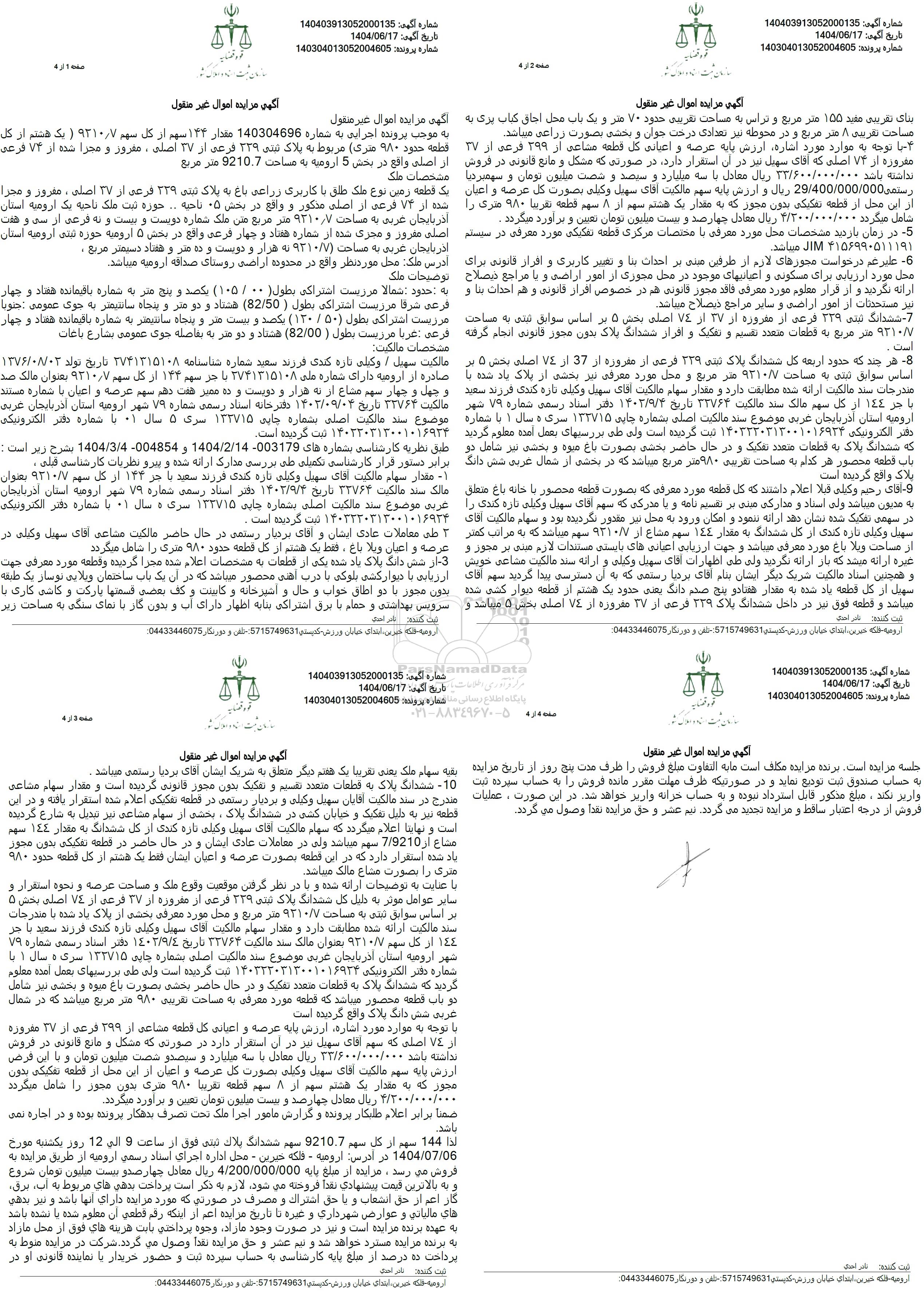 موضوع مزایده : پلاک ثبتی 229 فرعی از 37 اصلی، مفروز و مجزی شده از 74 فرعی از اصلی به مساحت 9210.7 مترمربع به ارزش 29.400.000.000 ریال