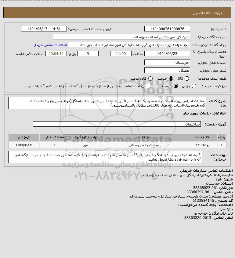 شرح کلی نیاز: عملیات اجرایی پروژه احداث جاده سرتیوک به قاسم آقایی شاه نشین شهرستان هفتگل(تهیه،حمل واجرای آسفالت گرم/قیرمحلول/اساس به طول 1100مترمطابق بااسنادپیوستی)