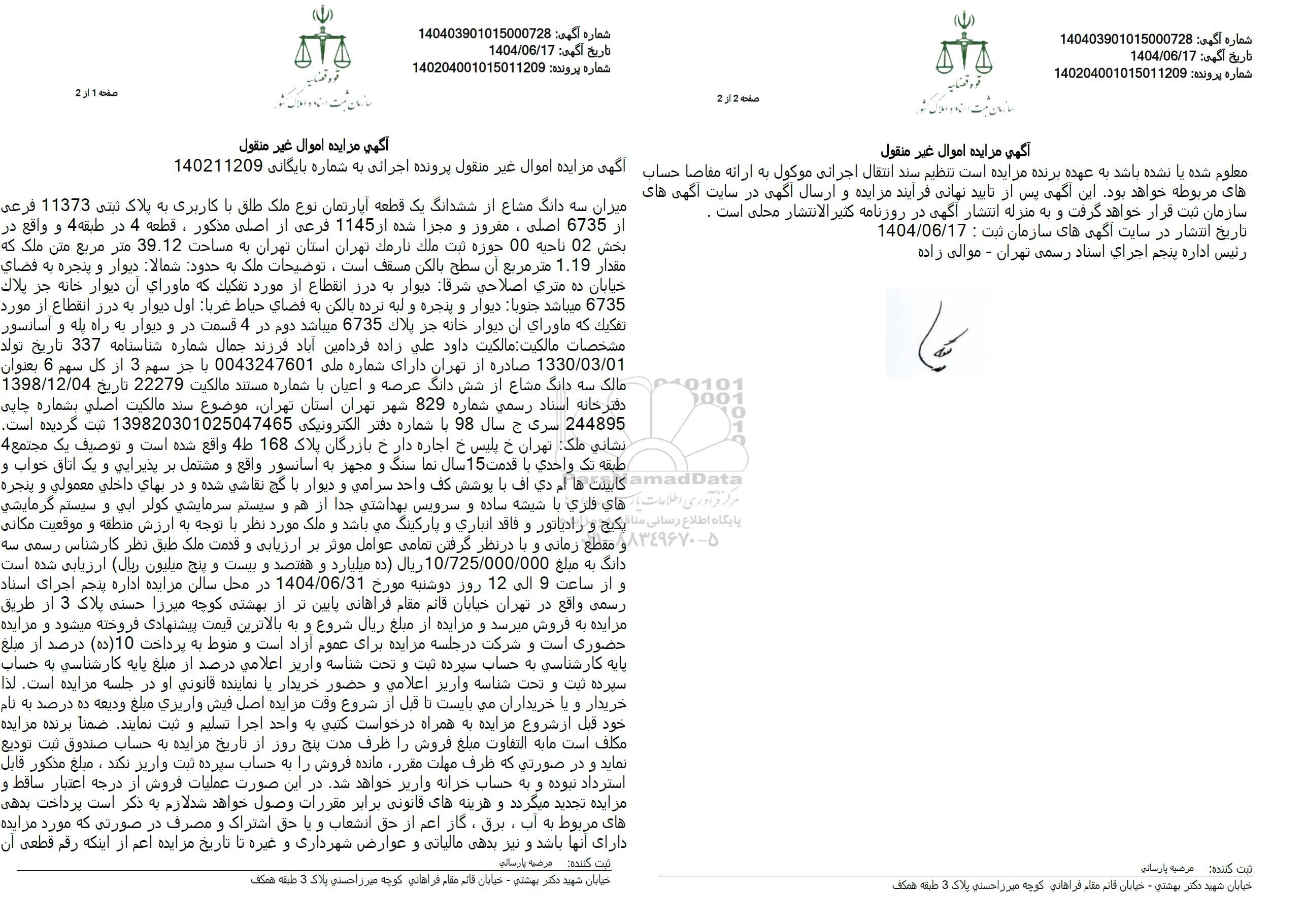 مزایده فروش سه دانگ مشاع از ششدانگ یک قطعه آپارتمان