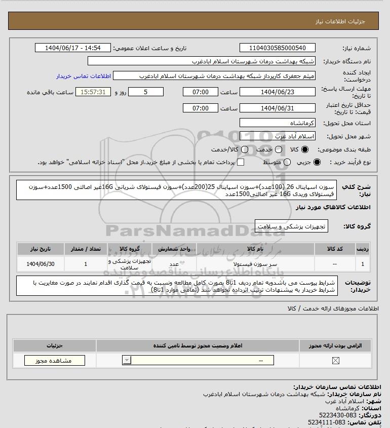استعلام سوزن اسپاینال 26 (100عدد)+سوزن اسپاینال 25(200عدد)+سوزن فیستولای شریانی 16Gغیر اصالتی 1500عدد+سوزن فیستولای وریدی 16G غیر اصالتی1500عدد, استعلام سوزن اسپاینال 26 (100عدد)+سوزن اسپاینال 25(200عدد)+سوزن فیستولای شریانی 16Gغیر اصالتی 1500عدد+سوزن فیستولای وریدی 16G غیر اصالتی1500عدد