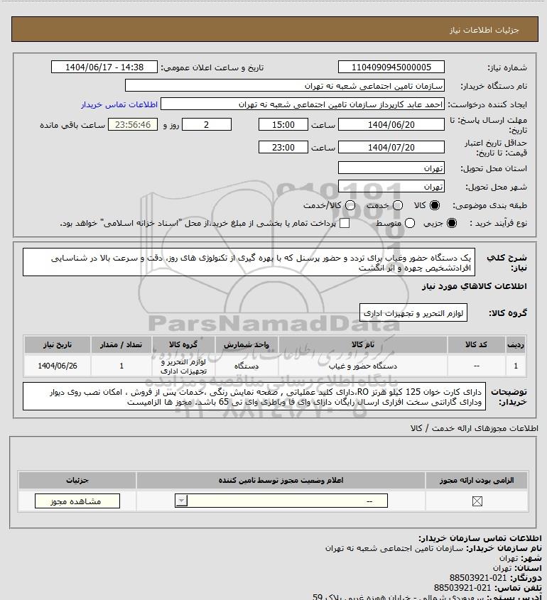 نام سازمان خریدار: سازمان تامین اجتماعی شعبه نه تهران