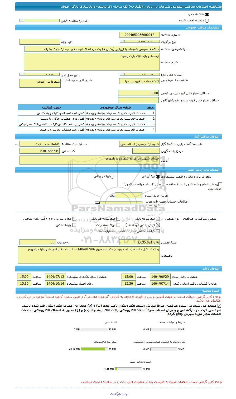 آخرین دریافت پیشنهادها و تاریخ بازگشایی پاکت‌ها و اطلاعات دقیق‌تر درباره شرایط این مناقصه و نحوه ارسال مدارک، و الزامات پروژه در اطلاعات تکمیلی این آگهی مناقصه درج شده است. لطفا ثبت نام کنید تا اطلاعات کامل را ببینید. علاقه‌مندان می‌توانند جهت دریافت اسناد و اطلاعات تکمیلی، مناقصه مناقصه عمومی همزمان با ارزیابی (یکپارچه) یک مرحله ای توسعه و بازسازی پارک رضوان با سامانه مناقصات و مزایدات ایران پارس‌نماد داده ها 88349670 تماس حاصل نمایند.