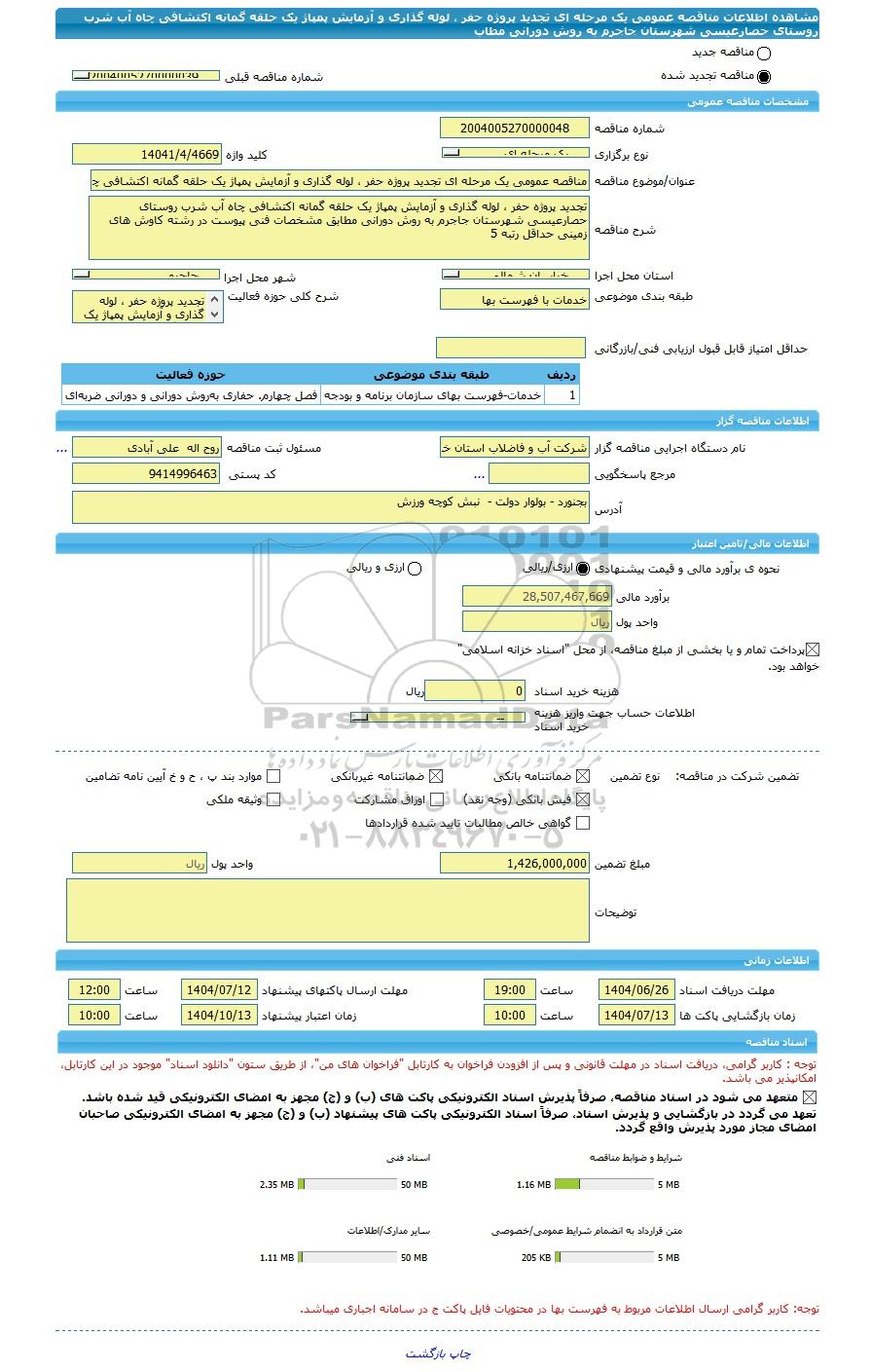 | مبلغ تضمین | 1,426,000,000 | واحد پول | ریال |