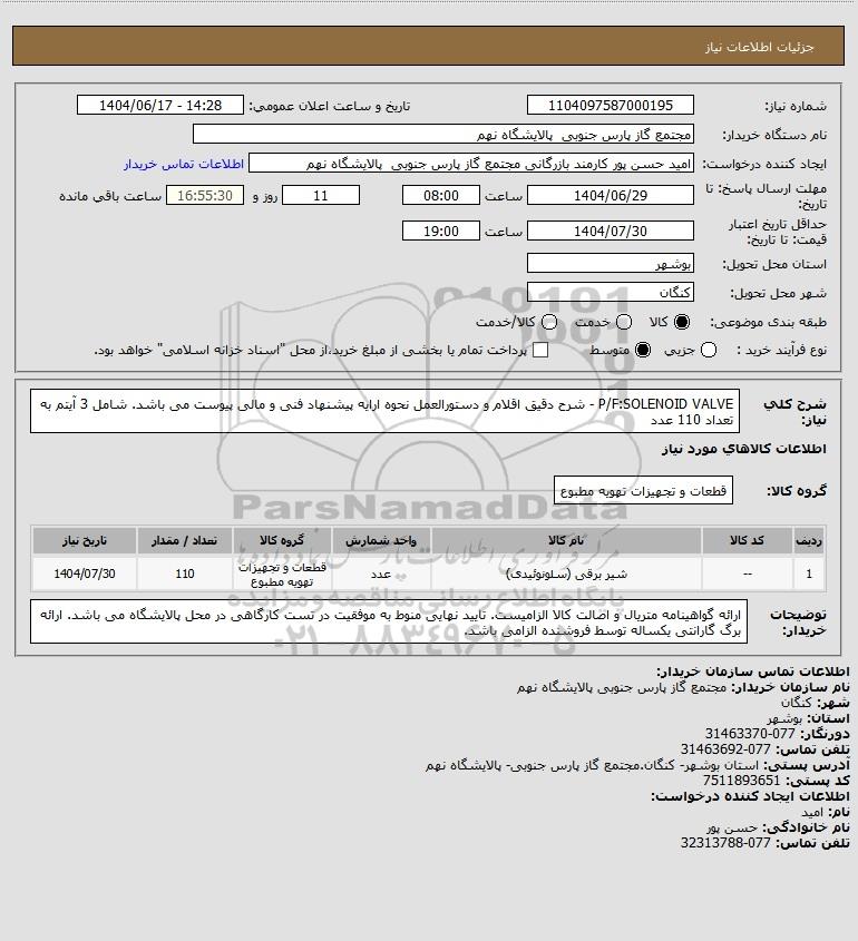 استعلام P/F:SOLENOID VALVE - شرح دقیق اقلام و دستورالعمل نحوه ارایه پیشنهاد فنی و مالی پیوست می باشد. شامل 3 آیتم به تعداد 110 عدد, استعلام P/F:SOLENOID VALVE - شرح دقیق اقلام و دستورالعمل نحوه ارایه پیشنهاد فنی و مالی پیوست می باشد. شامل 3 آیتم به تعداد 110 عدد