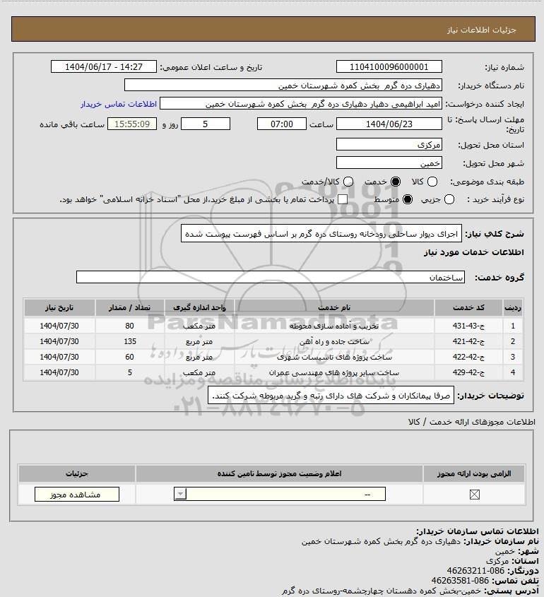 شرح کلی نیاز: اجرای دیوار ساحلی رودخانه روستای دره گرم بر اساس فهرست پیوست شده