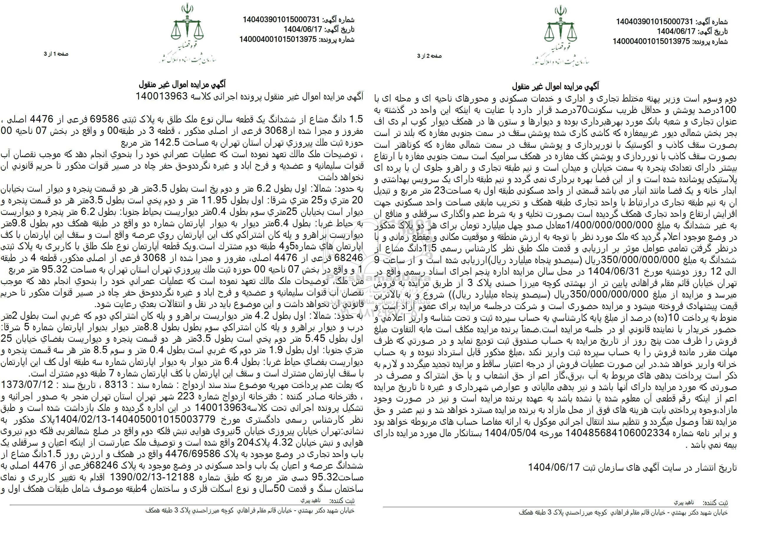 مزایده فروش یک قطعه سالن به پلاک ثبتی 69586 فرعی از 4476 اصلی