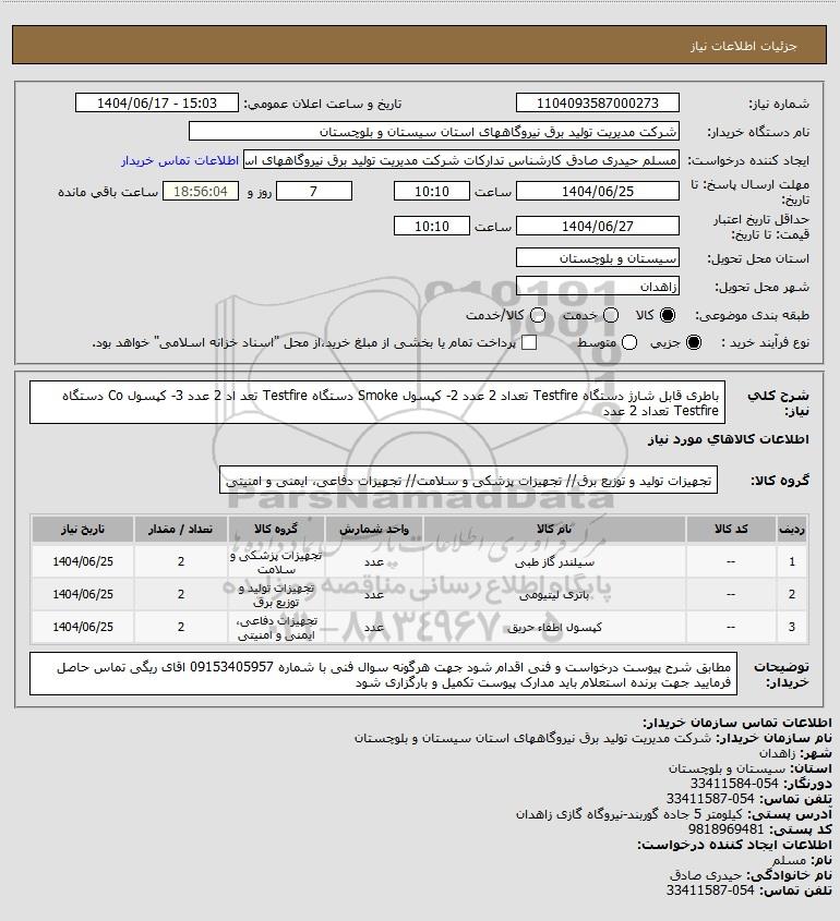 شرح کلی نیاز: باطری قابل شارژ دستگاه Testfire تعداد 2 عدد 2- کپسول Smoke دستگاه Testfire تعد اد 2 عدد 3- کپسول Co دستگاه Testfire تعداد 2 عدد