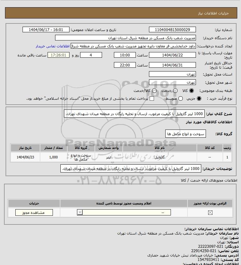 شرح کلی نیاز: 1000 لیتر گازوئیل با کیفیت مرغوب. ارسال و تخلیه رایگان در منطقه میدان شهدای تهران.