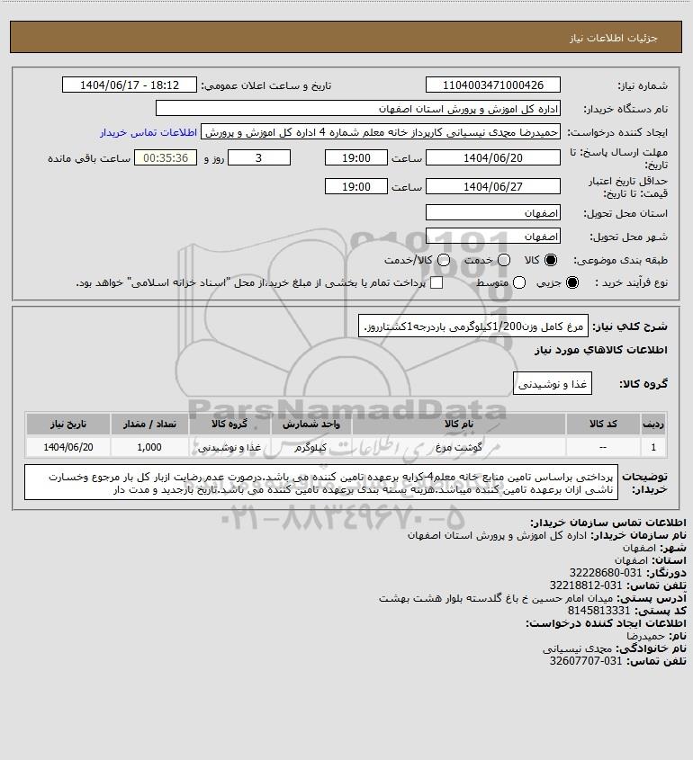 استعلام مرغ کامل وزن1/200کیلوگرمی باردرجه1کشتارروز., استعلام مرغ کامل وزن1/200کیلوگرمی باردرجه1کشتارروز.