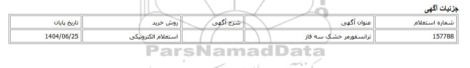 | 157788 | ترانسفورمر خشک سه فاز | استعلام الکترونیکی | 1404/06/25 |