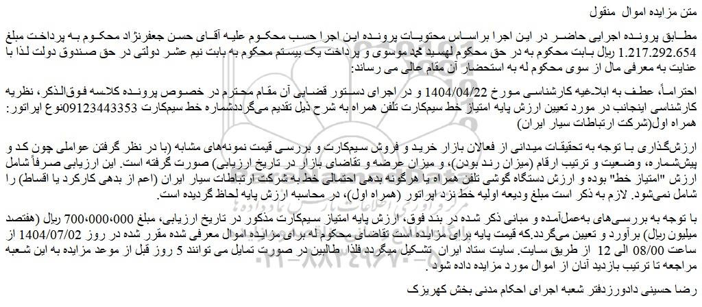 با توجه به بررسی های به عمل آمده و مبانی ذکر شده در بند فوق، ارزش پایه امتیاز سیم کارت مذکور در تاریخ ارزیابی، مبلغ 700،000،000 ریال (هفتصد میلیون ریال) برآورد و تعیین می گردد.که قیمت پایه برای مزایده است تقاضای محکوم له برای مزایده اموال معرفی شده مقرر شده در روز 1404/07/02 از ساعت 08/00 الی 12 از طریق سایت. سایت ستاد ایران تشکیل میگردد فلذا طالبین در صورت تمایل می توانند 5 روز قبل از موعد مزایده به این شعبه مراجعه تا ترتیب بازدید آنان از اموال مورد مزایده داده شود .
