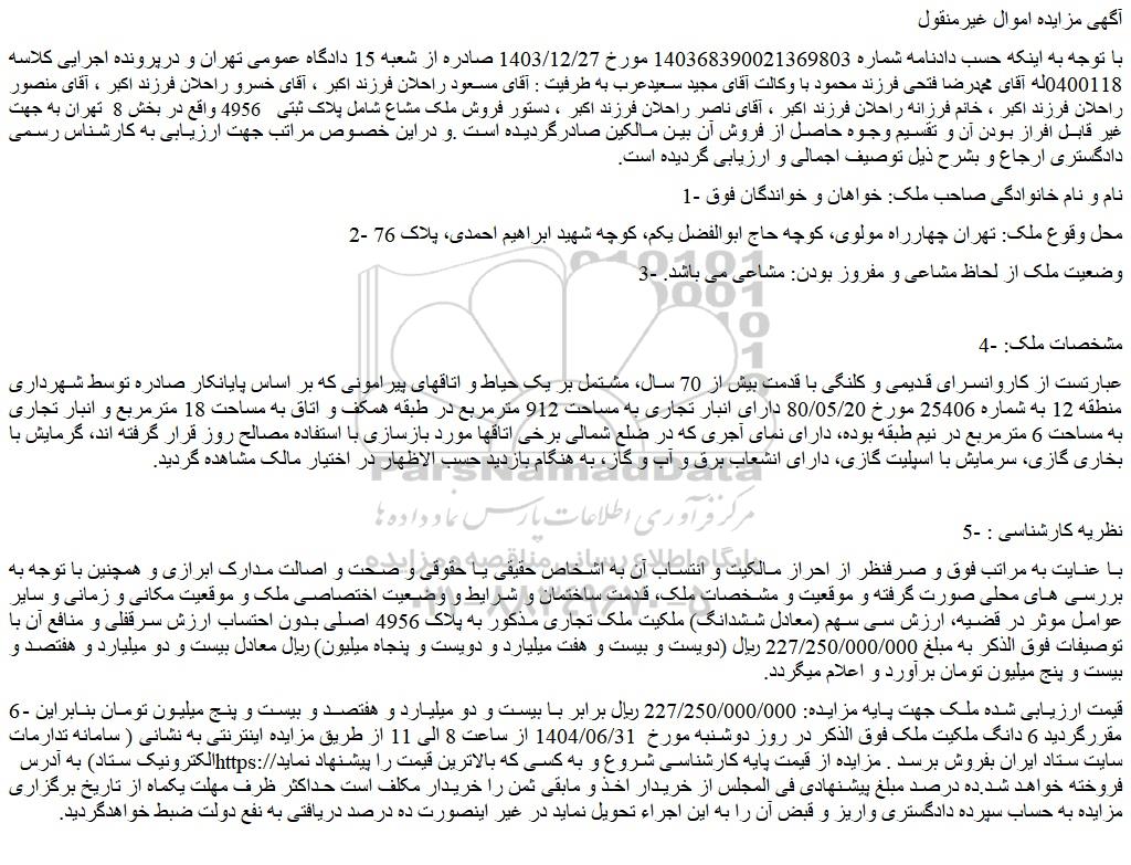با توجه به اینکه حسب دادنامه شماره 140368390021369803 مورخ 1403/12/27 صادره از شعبه 15 دادگاه عمومی تهران و درپرونده اجرایی کلاسه 0400118له آقای محمدرضا فتحی فرزند محمود با وکالت آقای مجید سعیدعرب به طرفیت : آقای مسعود راحلان فرزند اکبر ، آقای خسرو راحلان فرزند اکبر ، آقای منصور راحلان فرزند اکبر ، خانم فرزانه راحلان فرزند اکبر ، آقای ناصر راحلان فرزند اکبر ، دستور فروش ملک مشاع شامل پلاک ثبتی 4956 واقع در بخش 8 تهران به جهت غیر قابل افراز بودن آن و تقسیم وجوه حاصل از فروش آن بین مالکین صادرگردیده است .و دراین خصوص مراتب جهت ارزیابی به کارشناس رسمی دادگستری ارجاع و بشرح ذیل توصیف اجمالی و ارزیابی گردیده است.