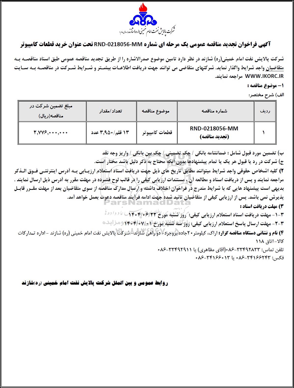 آگهی فراخوان تجدید مناقصه عمومی یک مرحله ای شماره RND- 0218056 -MM تحت عنوان خرید قطعات کامپیوتر