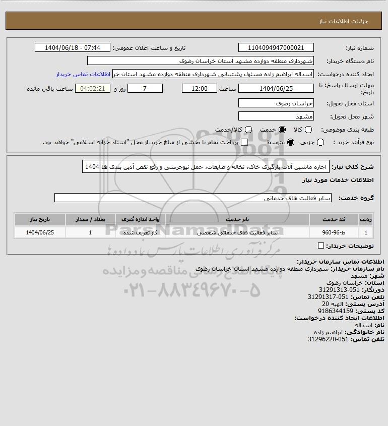 شرح کلی نیاز: اجاره ماشین آلات بارگیری خاک، نخاله و ضایعات، حمل نیوجرسی و رفع نقص آذین بندی ها 1404