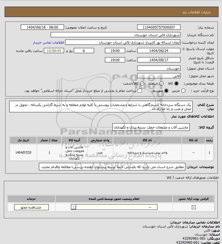 شرح کلی نیاز: یک دستگاه سردخانه کشتارگاهی با شرایط و مشخصات پیوستی با کلیه لوازم متعلقه و به شرط گارانتی یکساله ، تحویل در محل و نصب و راه اندازی آن