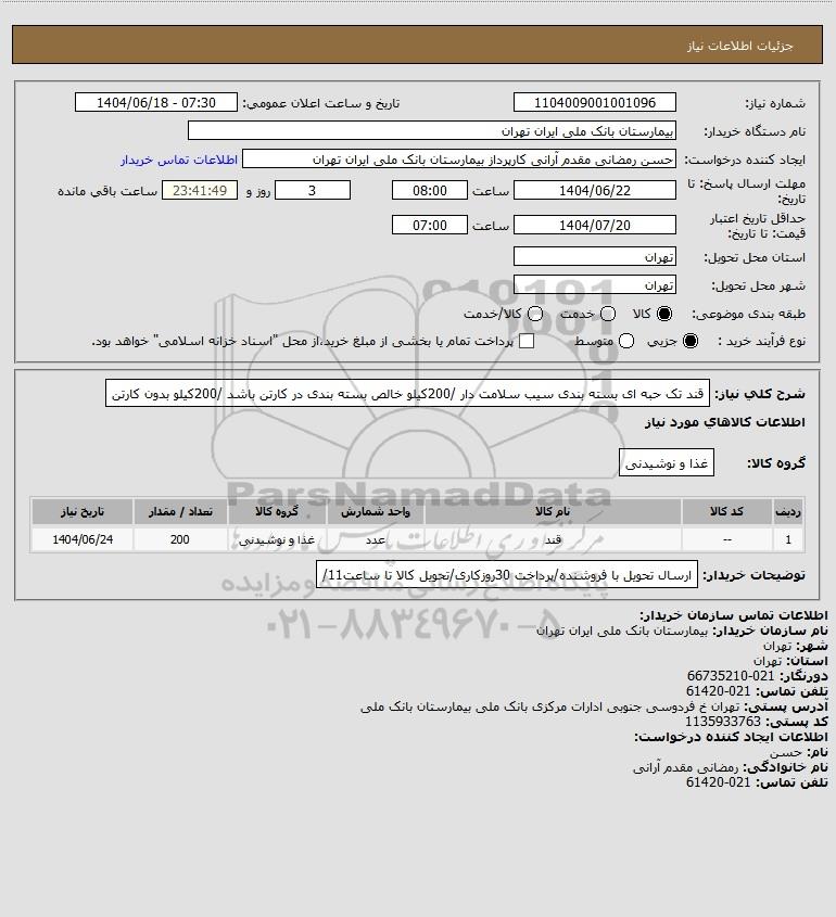 شرح کلی نیاز: قند تک حبه ای بسته بندی سیب سلامت دار /200کیلو خالص بسته بندی در کارتن باشد /200کیلو بدون کارتن